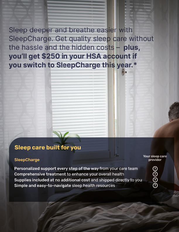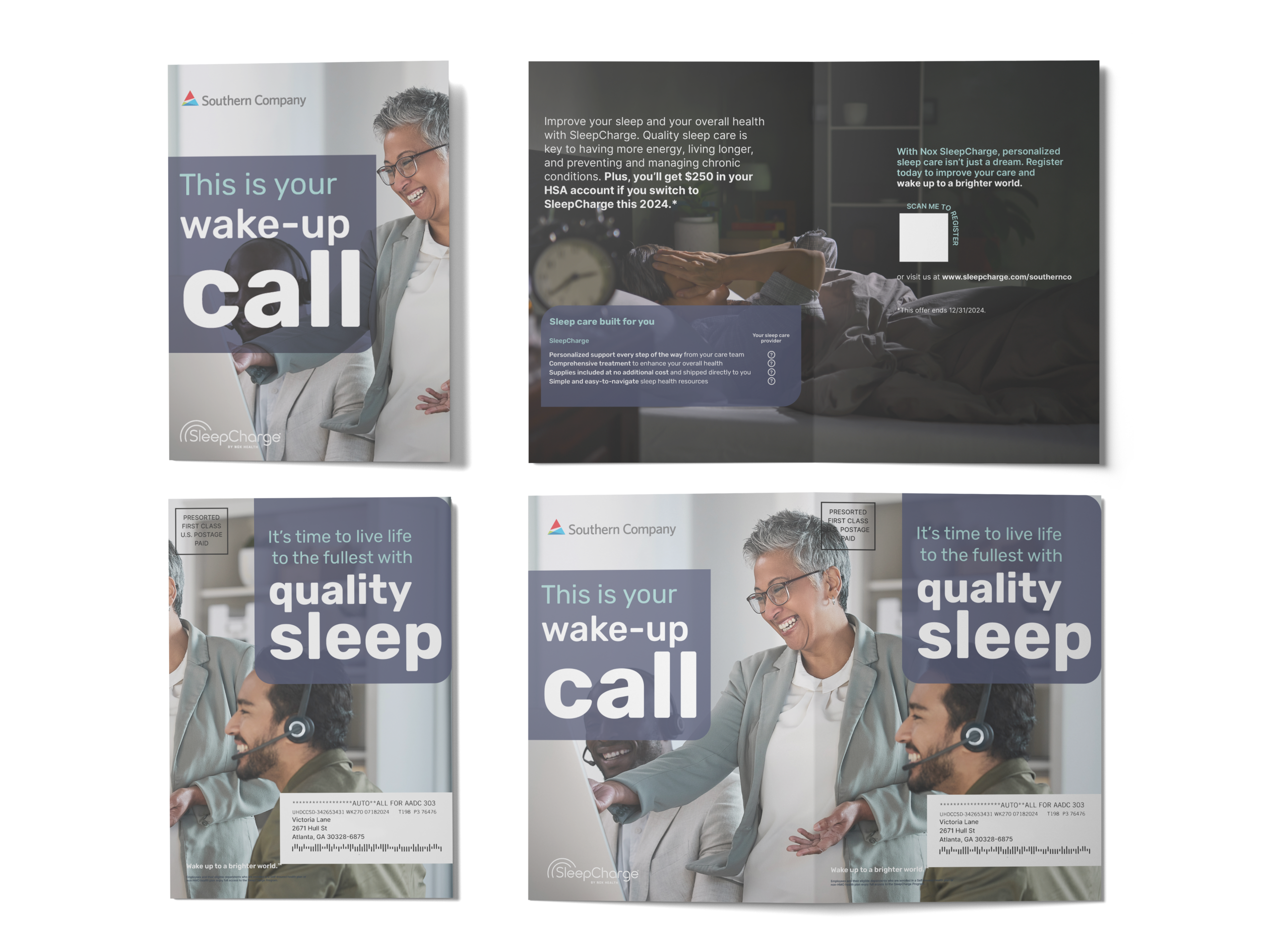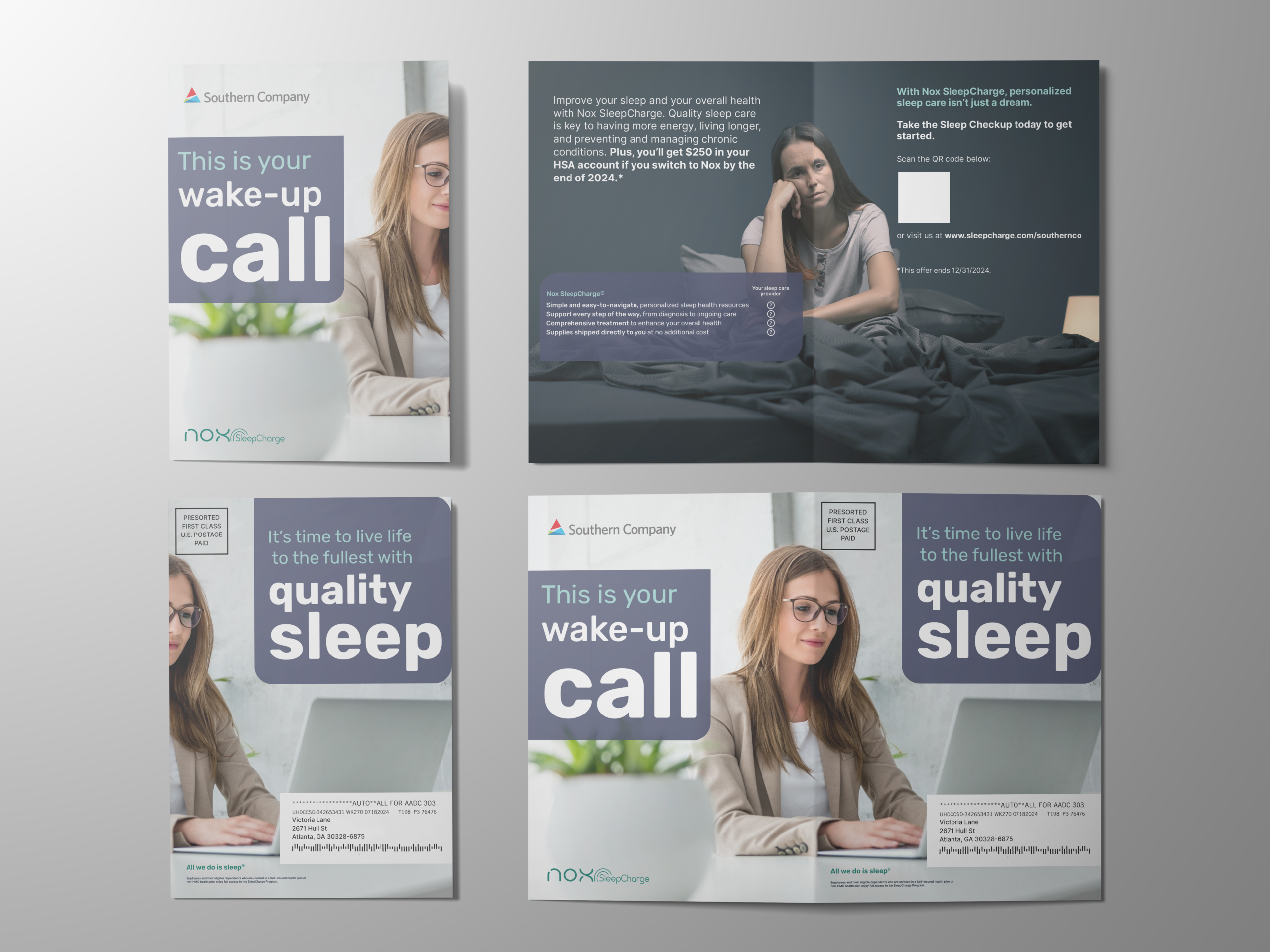 Our client needed a creative way to announce that their sleep care would be transferring to Nox. With personalized messaging, I chose to utilize the brochure panels to tell the story of sleep from the Southern Company employees’ point of view. The outside of the collateral featured day-to-day life at work, while the inside showed that person having trouble sleeping. As a personal touch, I chose the imagery based on the client and their provided demographic data.
